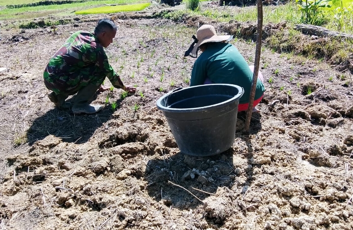 Membantu dan mendekatkan diri terhadap warga binaan, Babinsa koramil 01 Sikabaluan Sertu Sudirman turun langsung membantu petani menanam padi Gogo dilokasi kebun warga masyarakat.